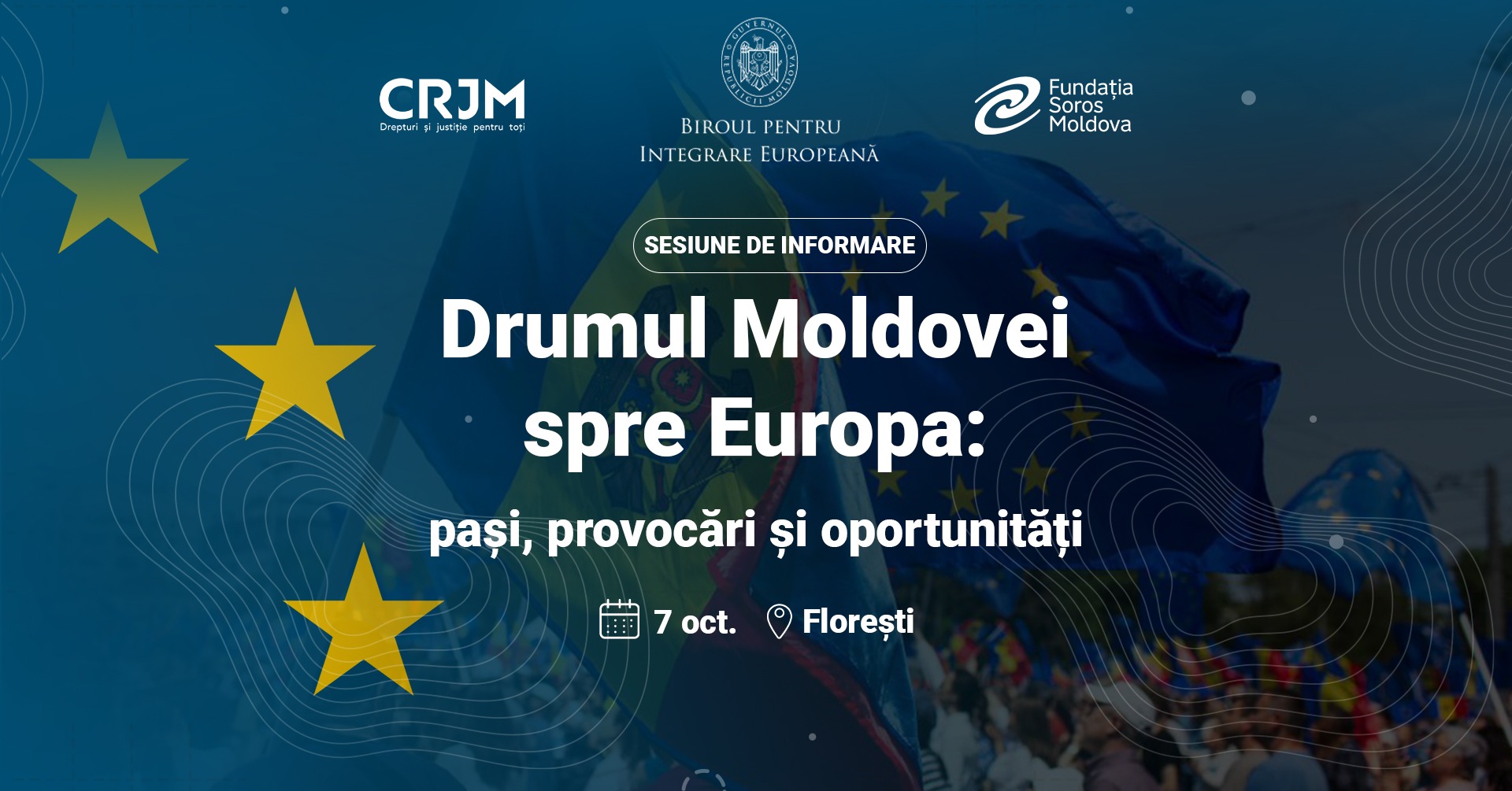 Centrul de Resurse Juridice din Moldova (CRJM), în parteneriat cu Biroul pentru Integrare Europeană și cu sprijinul Fundației Soros Moldova, organizează o serie de sesiuni de informare privind procesul de integrare europeană. Pe 7 octombrie, începând cu ora 11:00, cetățenii din raionul Florești și din regiune vor avea oportunitatea să afle principalele etape ale procesului de aderare, care sunt provocările și oportunităție acestui parcurs.